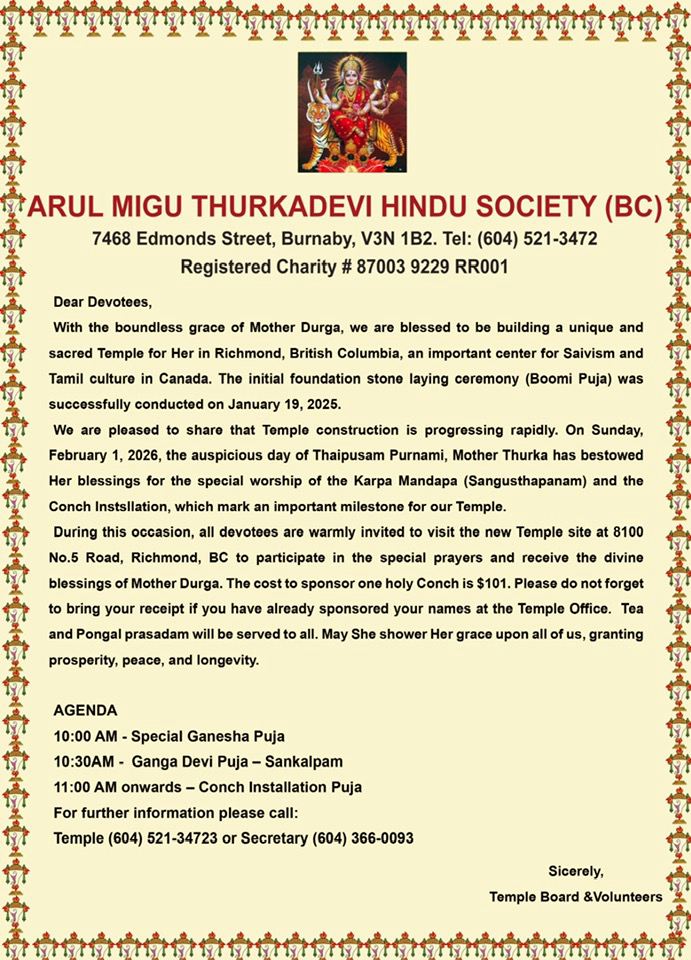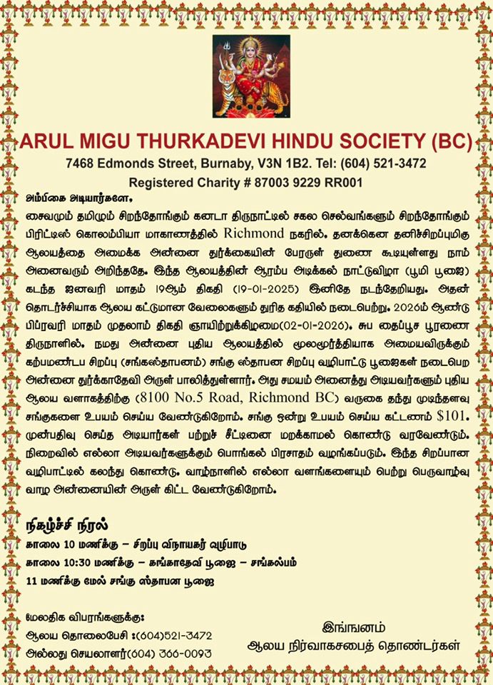 February poojas... Feb 1 - New Temple Sangusthabanam - Tamil... Feb 1 - New Temple Sangusthabanam - English... Fund raising for new temple, updates... Card Payment
